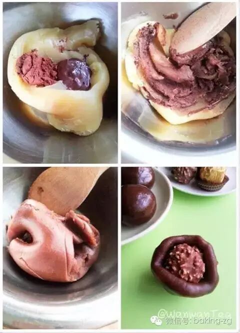 ⑤馅料:把白莲蓉、融化的黑巧和可可粉放入盆中