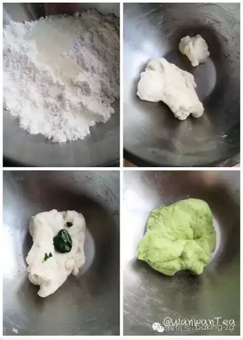 ③抹茶粉和热水拌匀后倒入面团中(240g),充分拌匀后分成六份备用